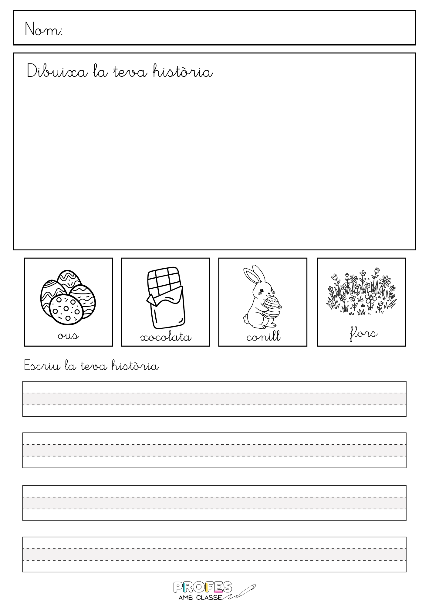 El material està pensat perquè sigui molt intuïtiu i motivador: primer dibuixen la seva història i després l’escriuen, utilitzant paraules guia com ous, xocolata, conill, flors o papallona, marieta, bosc, entre d’altres (com es veu a les fitxes de les pàgines 2, 3 i 4).